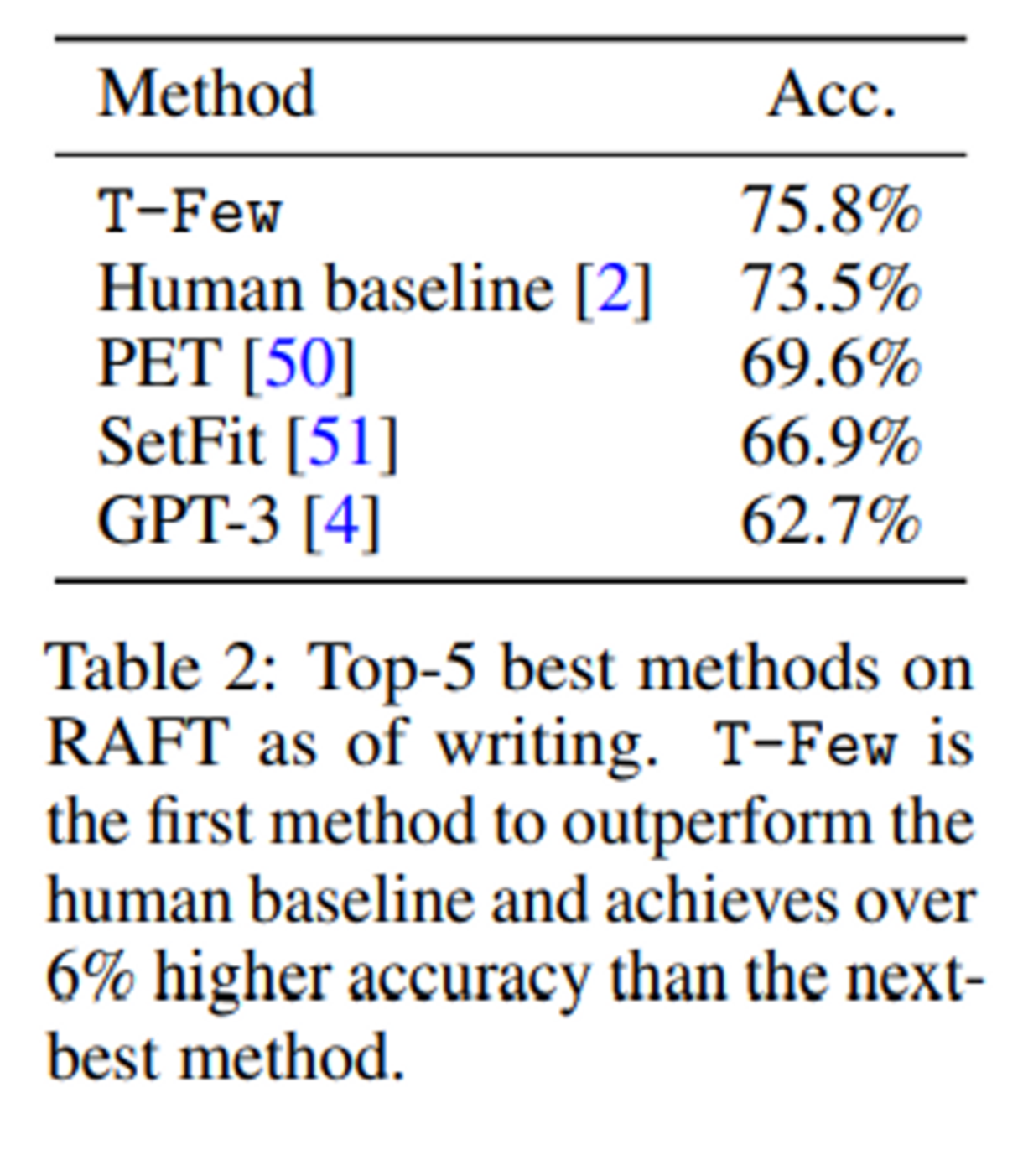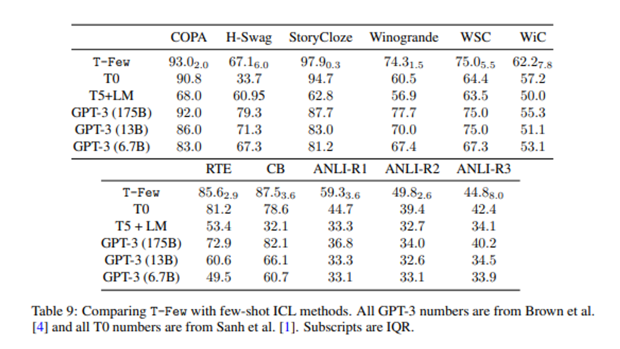T-Few 는 75.8% 로 sota 를 찍었고, 참고로 휴먼은 73.5% 이다.
