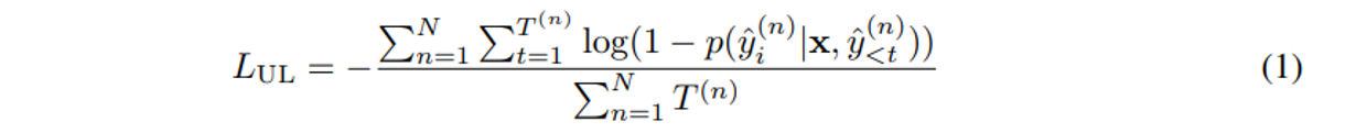 unlikelihood loss 는 틀린 토큰에 대해 계산하여 틀린 타겟 문장으로부터 다음 토큰을 예측하는 것을 막는 역할을 한다.