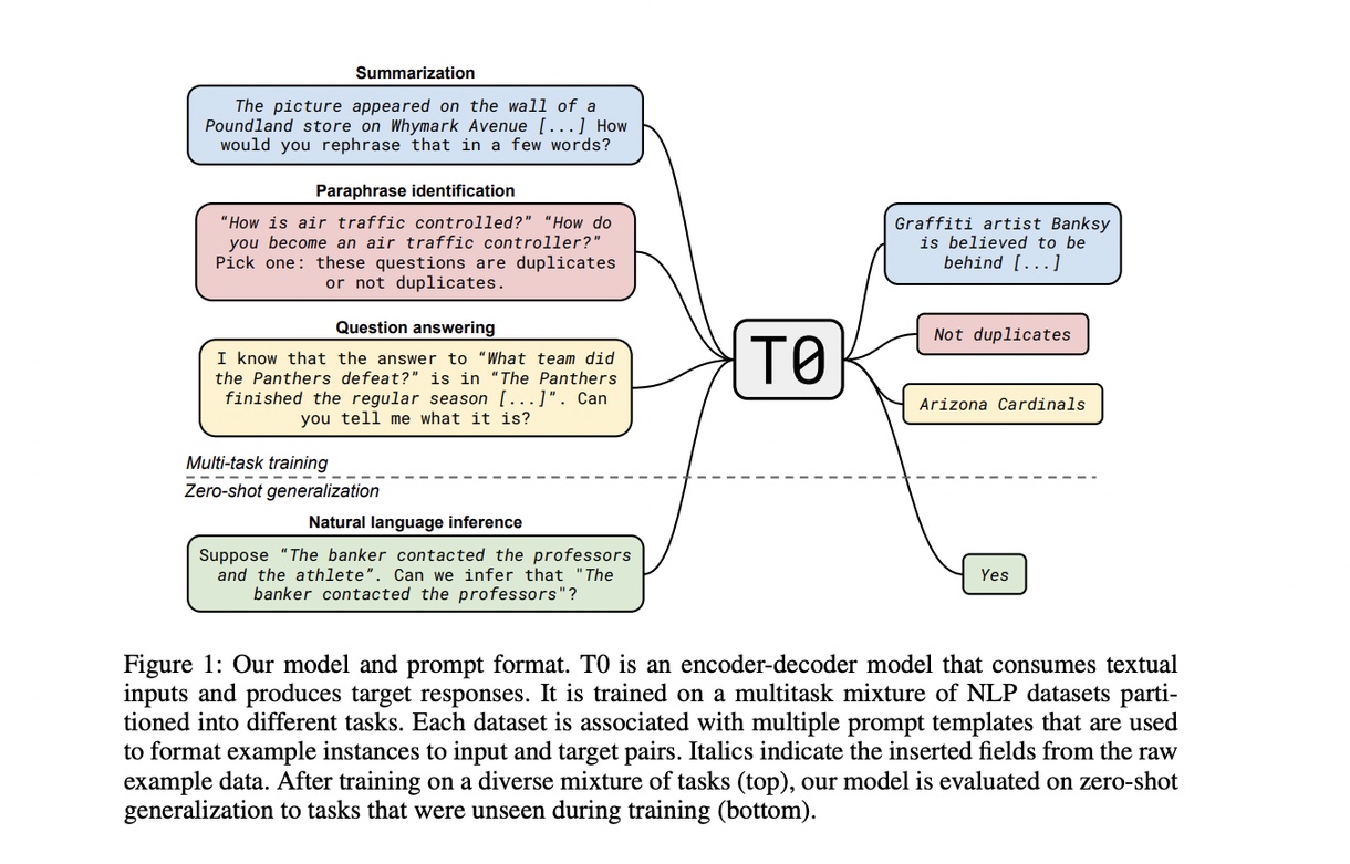 T0 는 T5 모델을 베이스로 하는 encoder-decoder Transformer model 로, 큰 unlabeled text data에서 masked language modeling objective 로 학습된다.