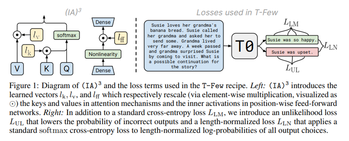 이 논문에서는 (IA)^3 라고 불리는 새로운 PEFT 방법을 소개하고 T-Few 라고 하는 "T0 모델을 기반으로 작업별 튜닝이나 파라미터 업데이트 적게 새로운 task 를 할 수 있는 방법” 을 제안한다.