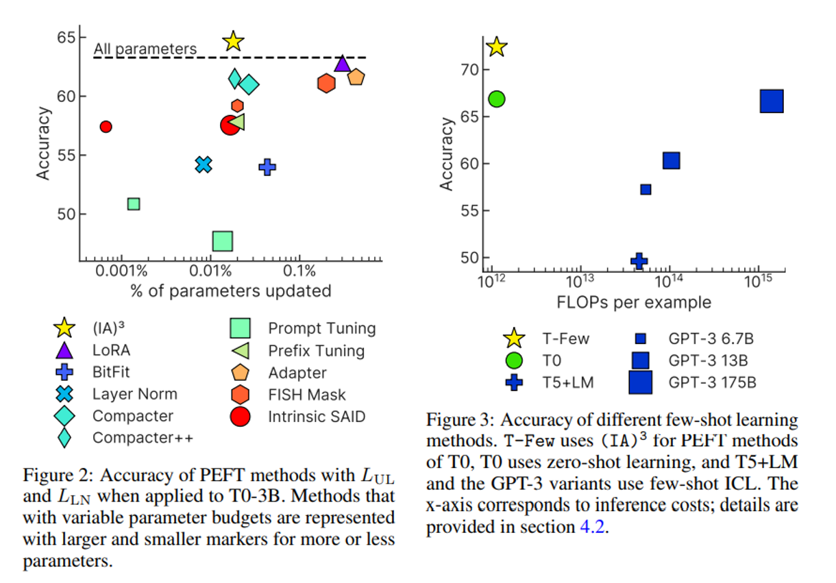 (IA)3 가 모델 전체 파인튜닝 보다 더 높은 정확도를 얻는 유일한 방법임을 확인하였다.