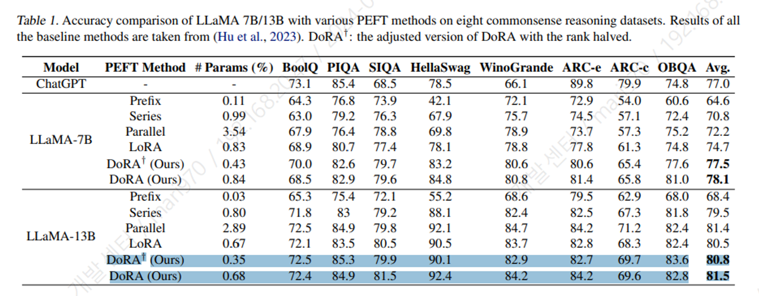 위에서는 full fine-tuning 보다 DoRA 의 성능이 더 좋은 데이터셋이 있는 것을 확인할 수 있다.