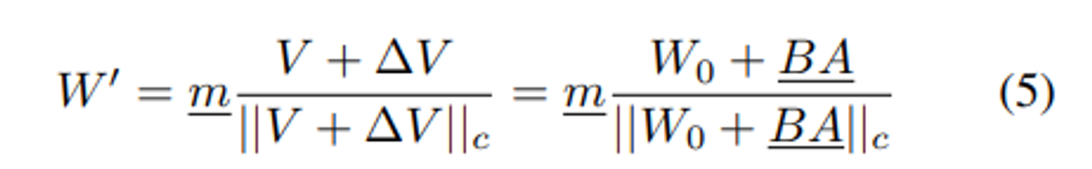 ∆V : 는 2개 low-rank 행렬 B 와 A 를 곱해서 학습한 incremental directional update 이고,
