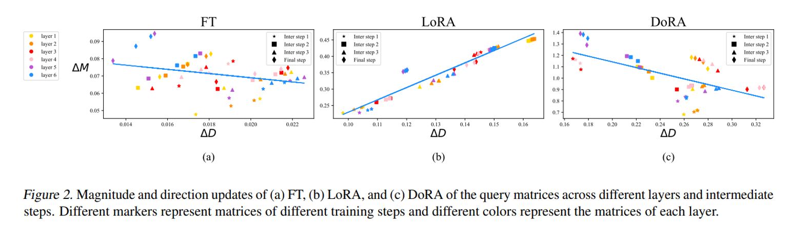 (∆D, ∆M) 의 regression line 은 LoRA 와 달리 FT 처럼 DoRA 는 확실한 negative 기울기임을 확인할 수 있다.