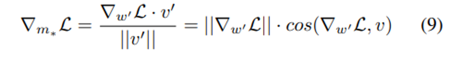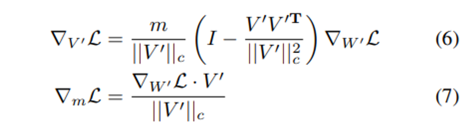 $∇_{W′}L$ 가 $\cfrac{m}{||V′||c}$에 의해 스케일링되고 현재 weight 행렬에 projection 된다.
