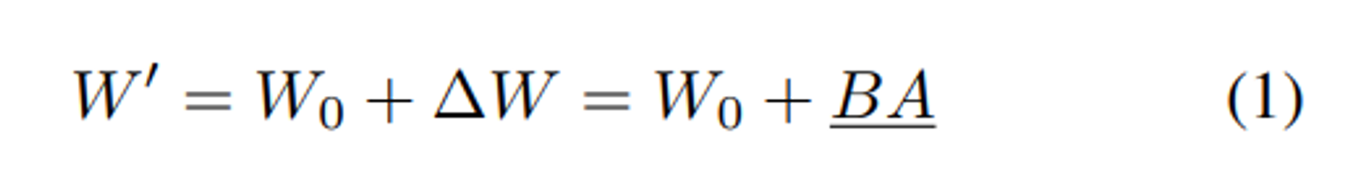 파인 튜닝 중 weight update 는 low intrinsic rank 를 가진다는 가정하에 2개의 low rank 행렬 AB 를 사용하여 업데이트한다.