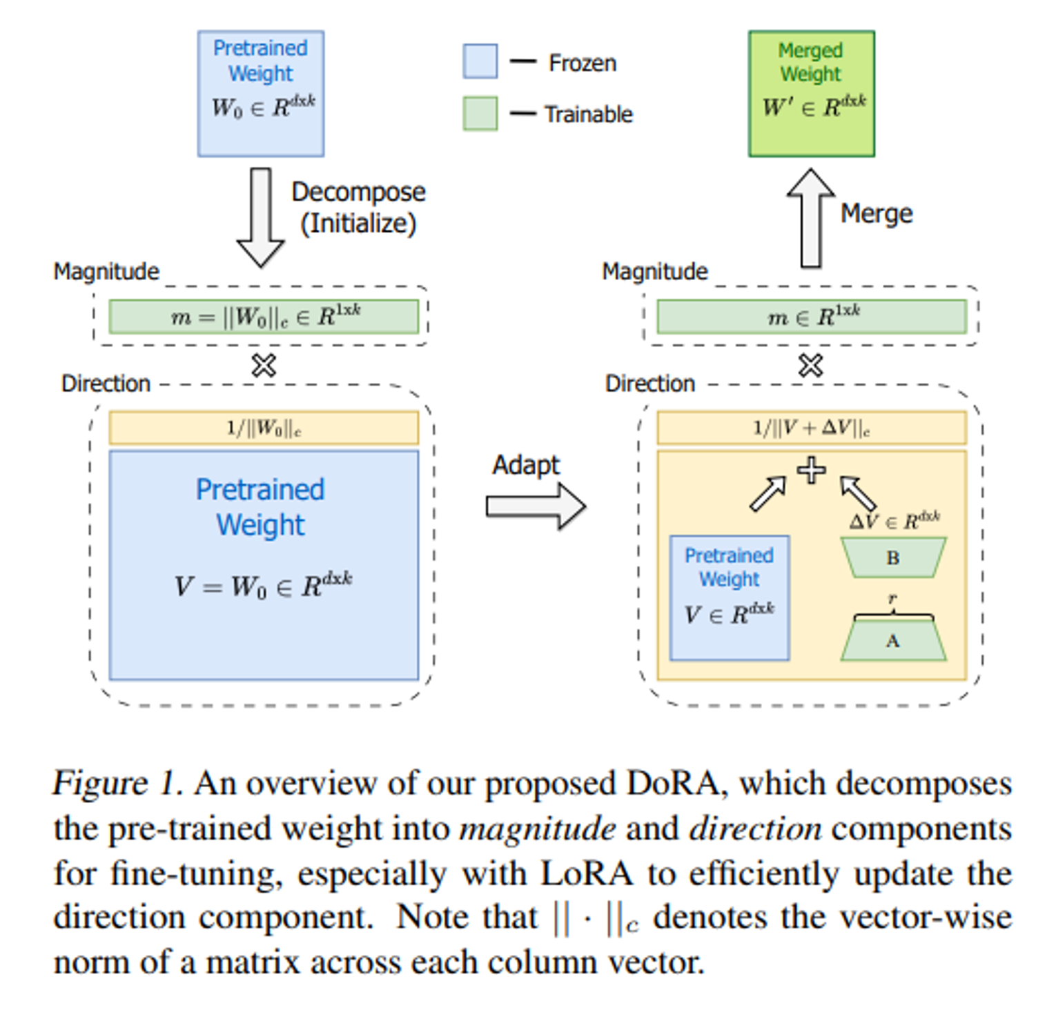 weight 를 magnitude(크기)와 direction(방향)으로 나눈 후 둘 다 파인튜닝한다. 이 때, 방향 행렬의 파인튜닝에는 LoRA 를 사용한다.