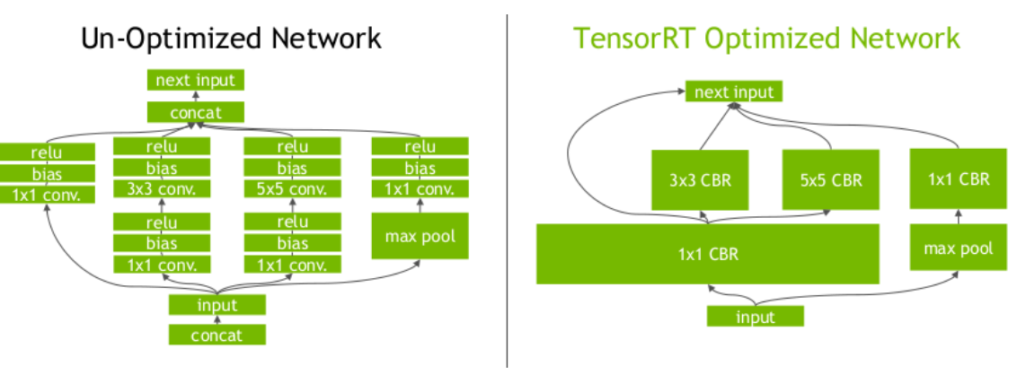 TensorRT 에서는 이를 더 효율적으로 하기위해 각 연산들 중 동시에 계산할 수 있는 연산들을 합쳐서 (fusion) 같이 통신해준다.