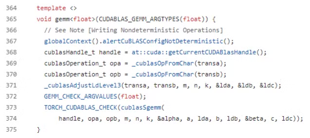 아래 코드 캡처를 보면 gemm 안에서 cublasSgemm 을 호출하고 있는 것을 확인할 수 있다.